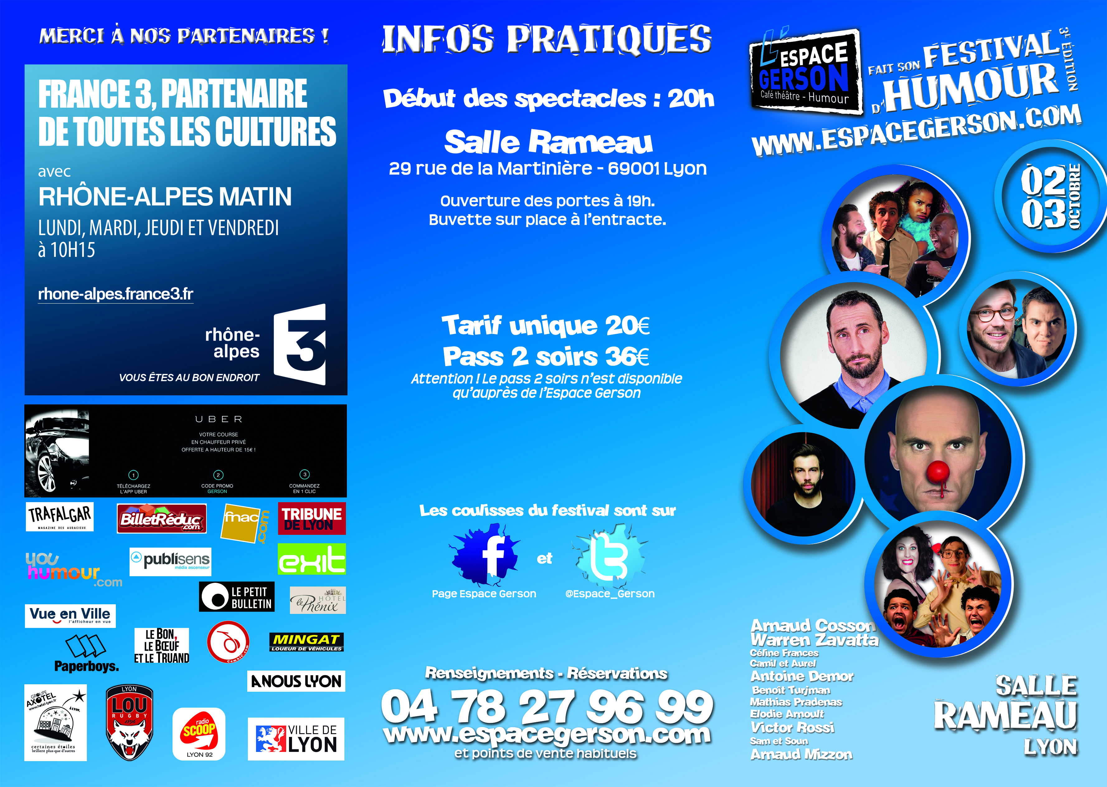 L'Espace Gerson : L'endroit où il fait bon Rire ! Situé dans le Vieux Lyon, l'Espace Gerson est le plus ancien café-théâtre de Lyon, une référence en matière de découverte de jeunes talents de l'Humour. Entre sa programmation éliste (Gustave Parking, Florence Foresti, Gad Elmaleh, entre autre) et ses 25 ans d'expérience en la matière, vous n'aurez plus d'autres choix que de venir passer une excellente soirée dans ce café théâtre ! Et si l'envie vous prends, vous pouvez également vous diriger vers le bar pour remplir votre panse avec de bonne bières ou tout simplement l'inimitable assiette de charcuterie et de fromage accompagné de son verre de vin.
