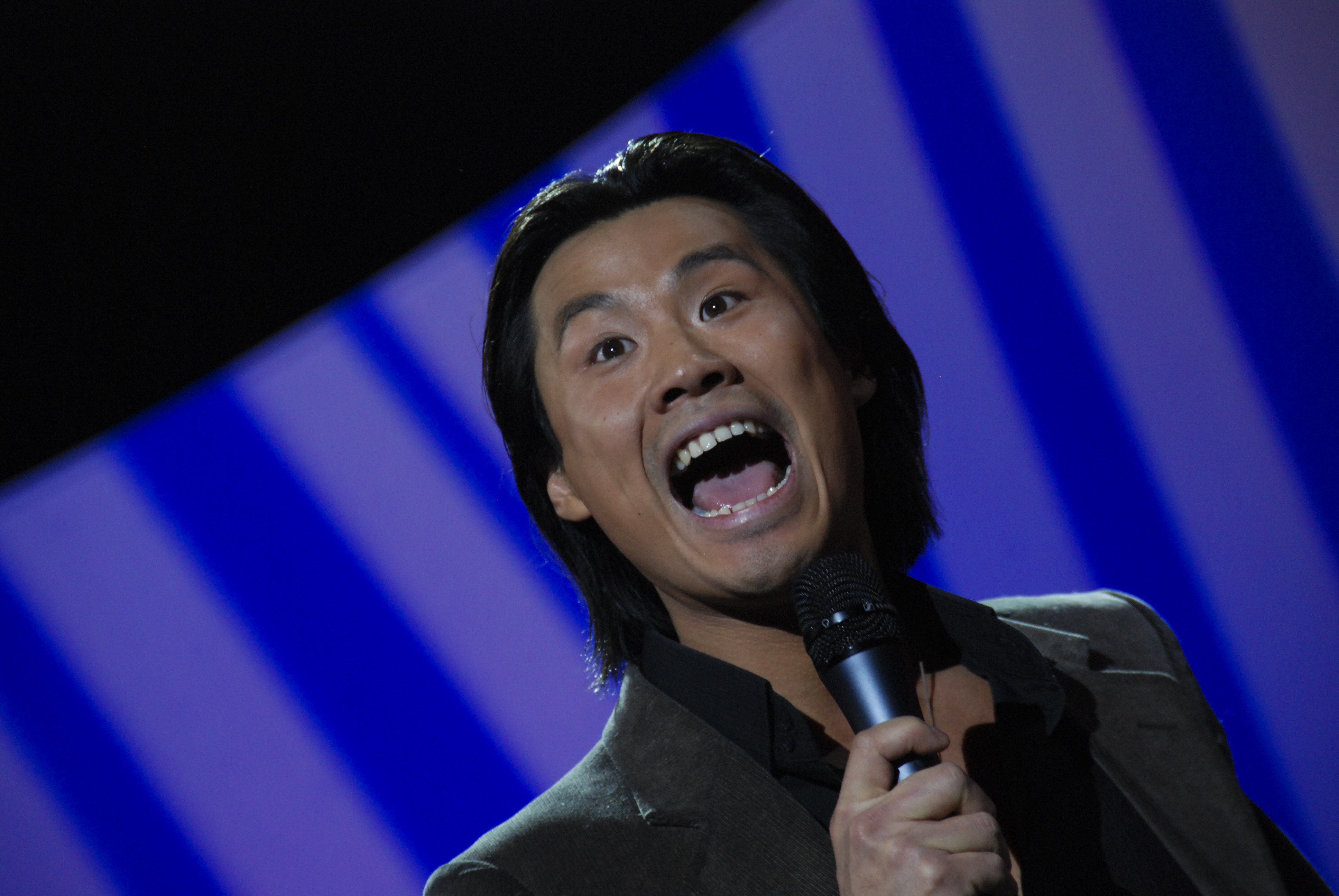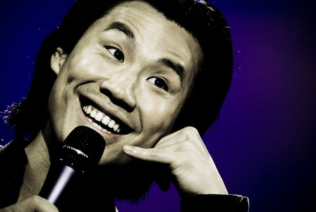 Sur scène, il s'amuse souvent du fait d'être le seul asiatique de la bande. Elégant et souriant, il se moque de son père, des chinois, de leur cuisine ou encore de leurs rôles au cinéma : "Pas facile d'être un comédien asiatique si tu sais pas faire de karaté, de nems, ou que tu connais rien en informatique !".